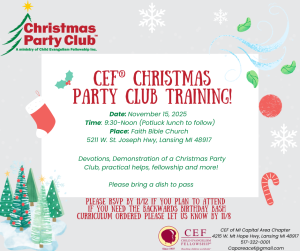 1. We are starting the process of looking for Christmas Party Club™ locations. Please pray that many people/churches will be interested in hosting them at their local school. There will be a training class November 15th, please consider joining us!